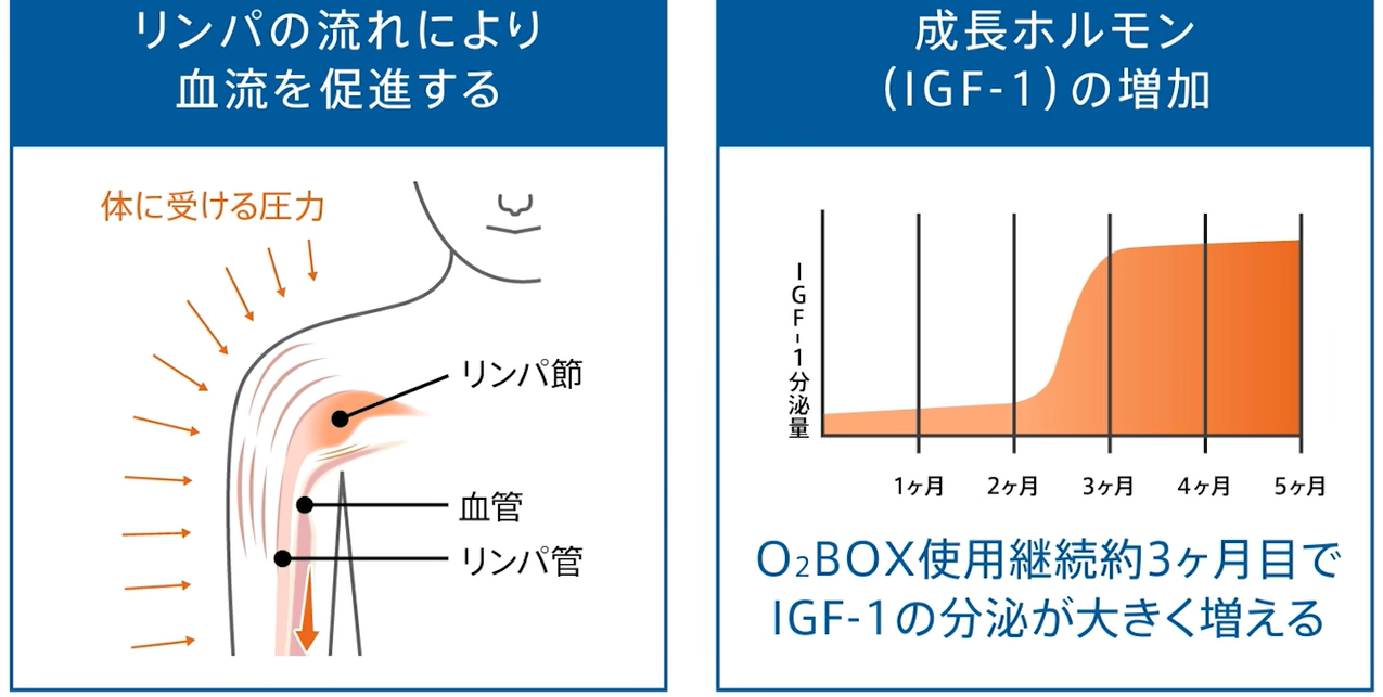 オーツボックスは内部に高気圧環境・高濃度酸素を作り出すことで高知る的な酸素吸収を可能にします。